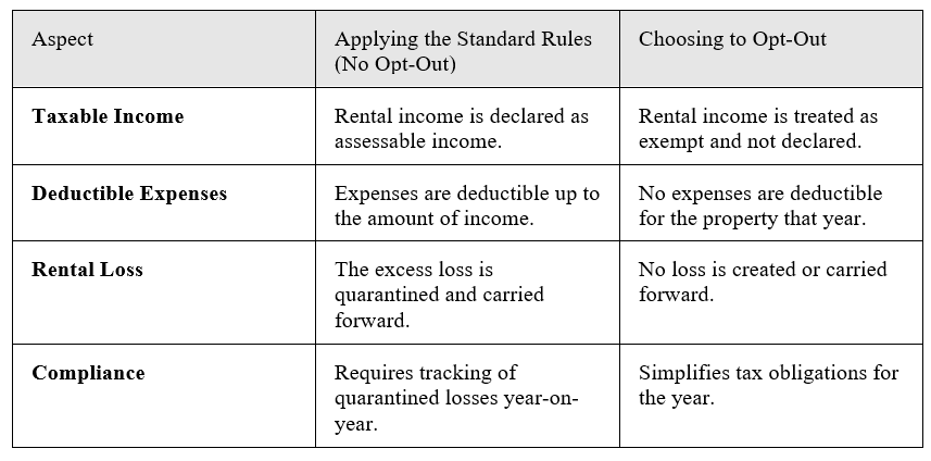 The opt-out is a simplification measure given by the IRD. It allows you to choose an easier path: instead of tracking a quarantined loss for years, you can simply remove the property’s income and expenses from your tax return for that year.